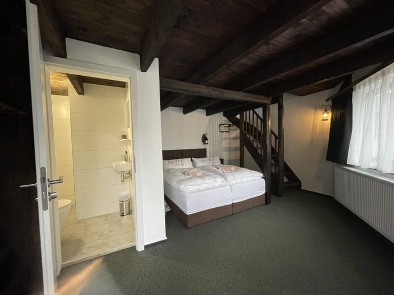 Im Erdgeschoss gibt es ein Schlafzimmer mit Doppelbett, Dusche und WC.